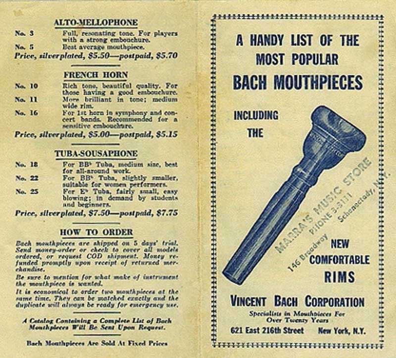 - Bach Mouthpiece Models by Year. Retrieved 6/12/25. https://bachloyalist.com/bach-mouthpiece-models-by-year/